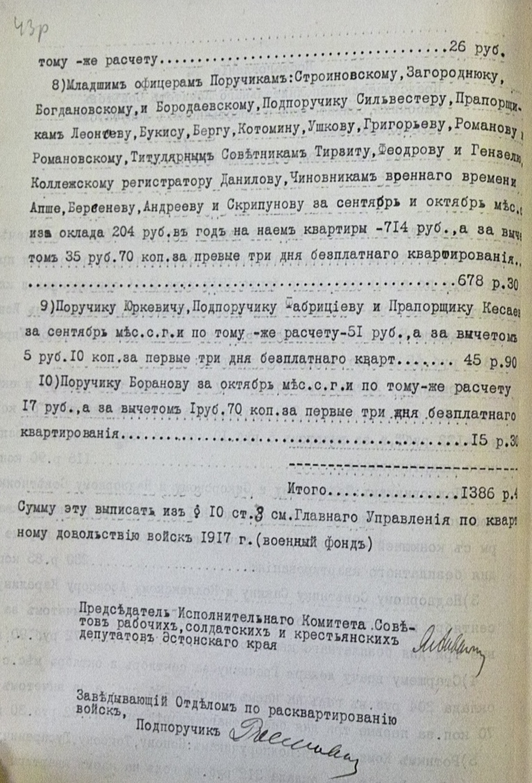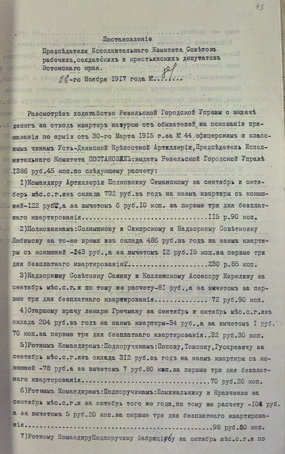 Постановление о выдаче денег за отвод квартир натурою от обывателей офицерским и классным чинам Усть-Двинской крепостной артиллерии. ERA.R-1290.1.154.